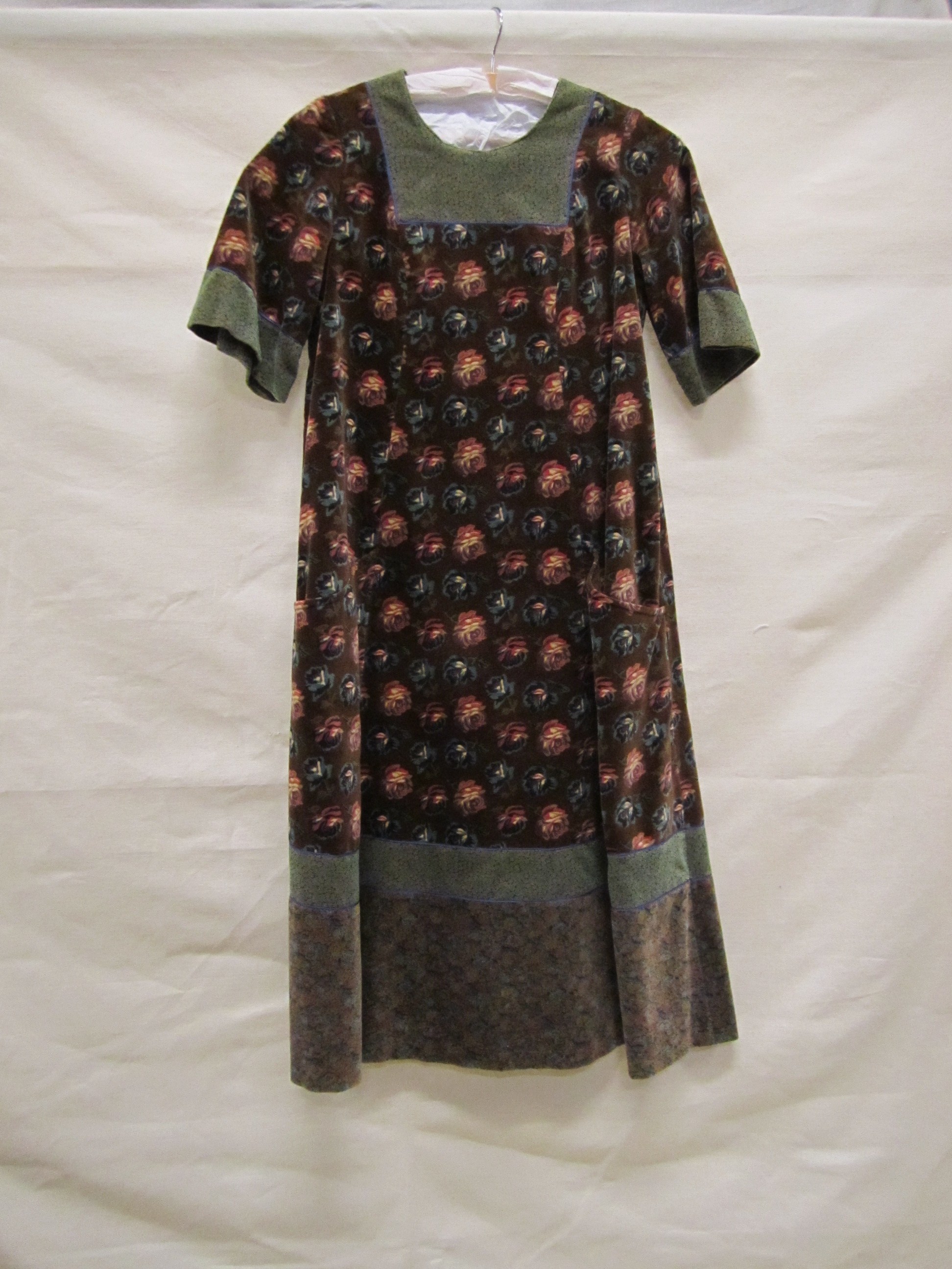 Jurk, bruin fluweel bedrukt met rozenmotief, in fokl...