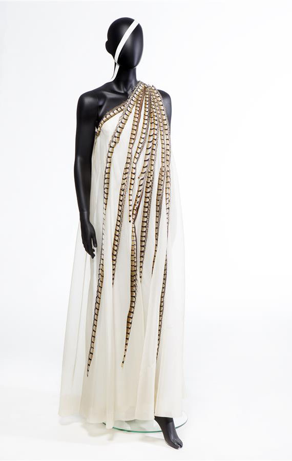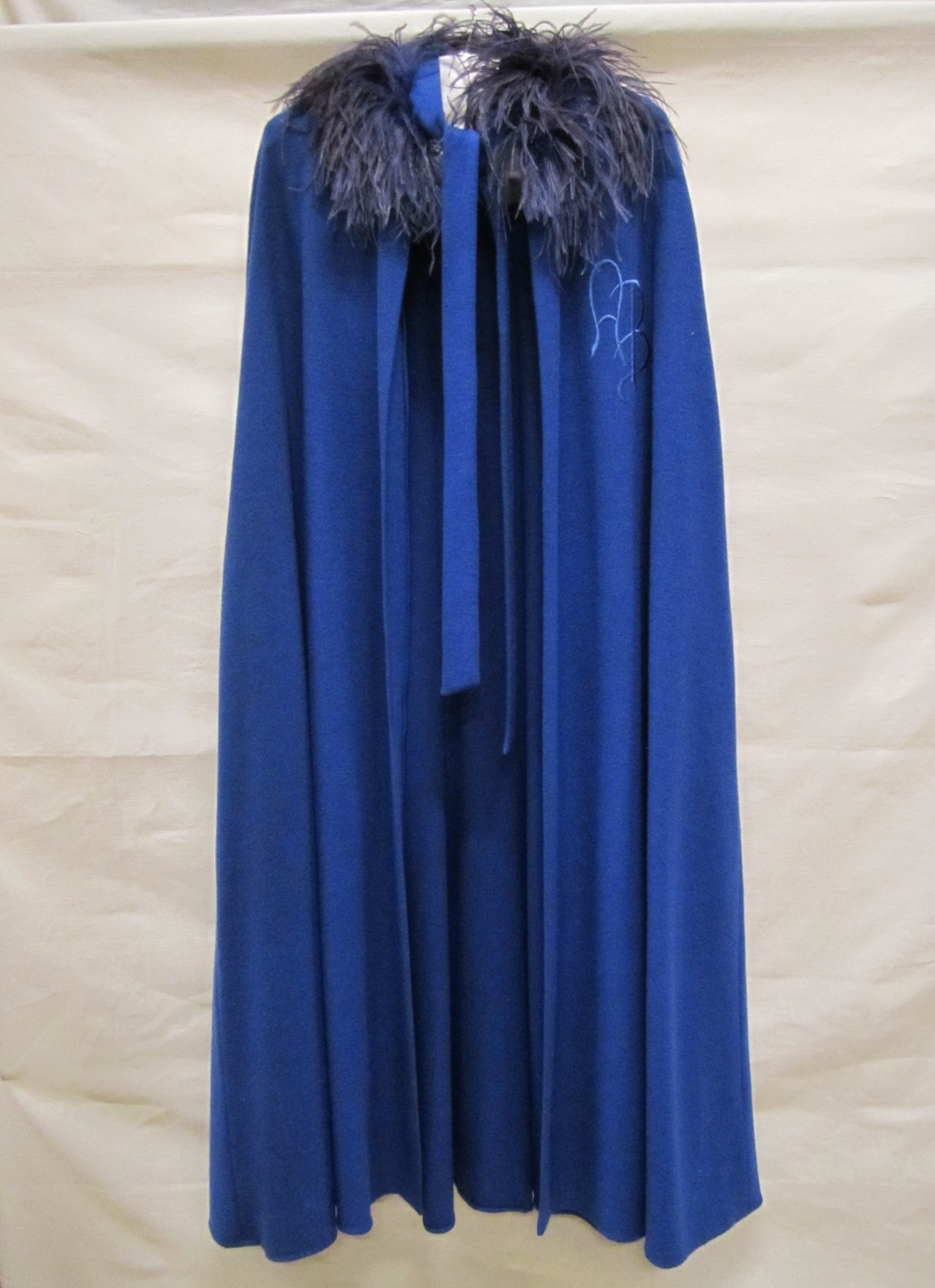 Cape van blauwe wol met blauwe struisveren rond de h...