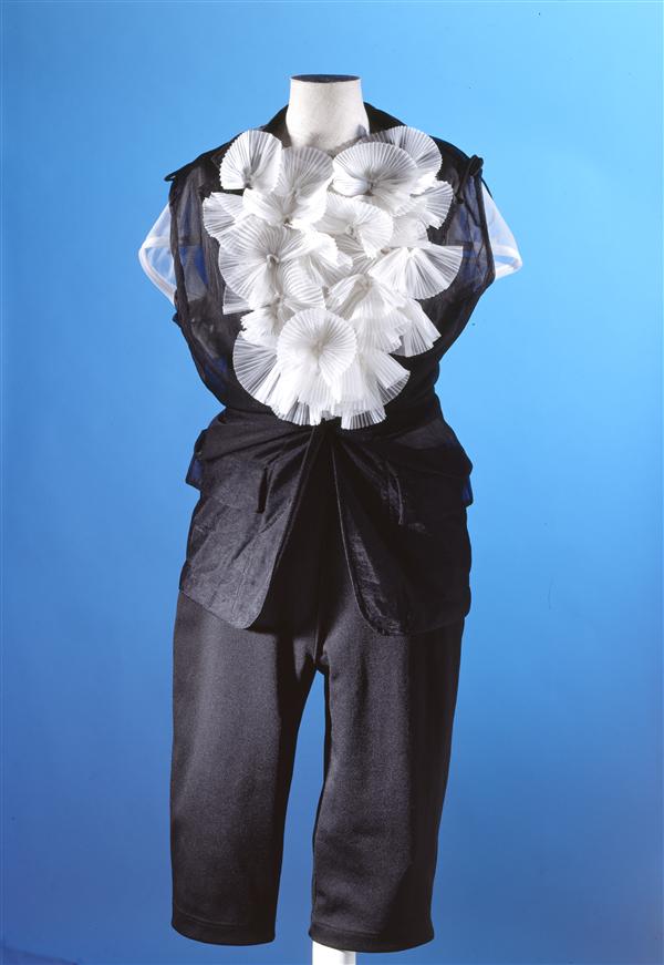 Ensemble, bestaande uit een wtte nylon top met waaie...