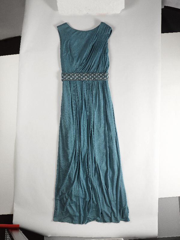 Avondjurk van blauw/groene zijden tricot, met ceintu...
