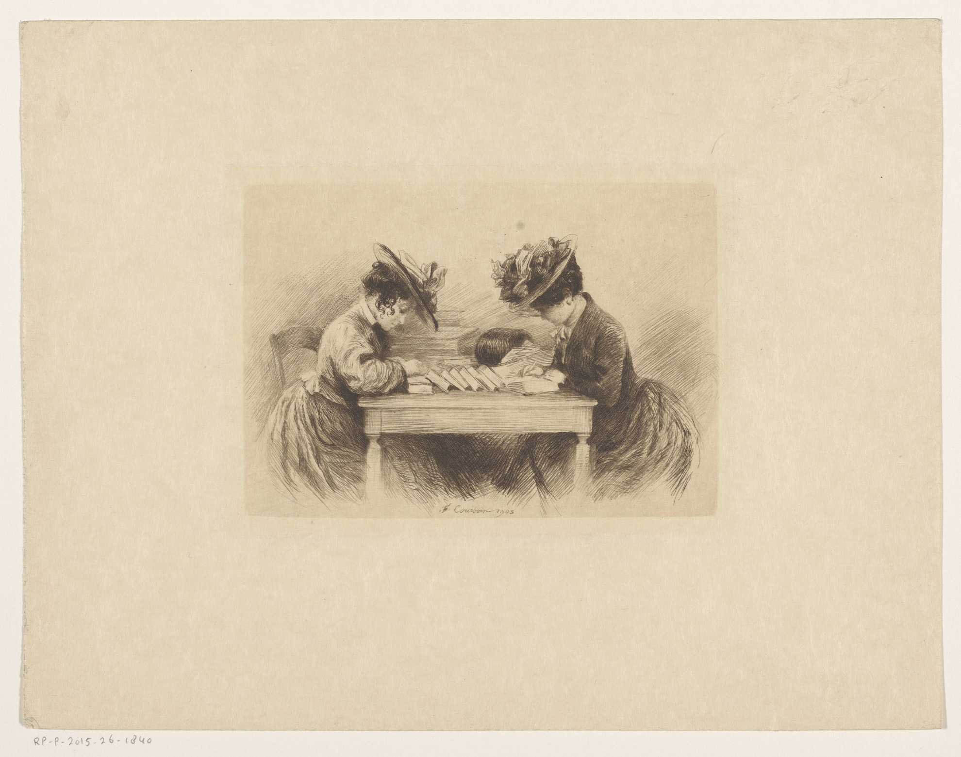 Twee vrouwen met hoeden aan een schrijftafel
