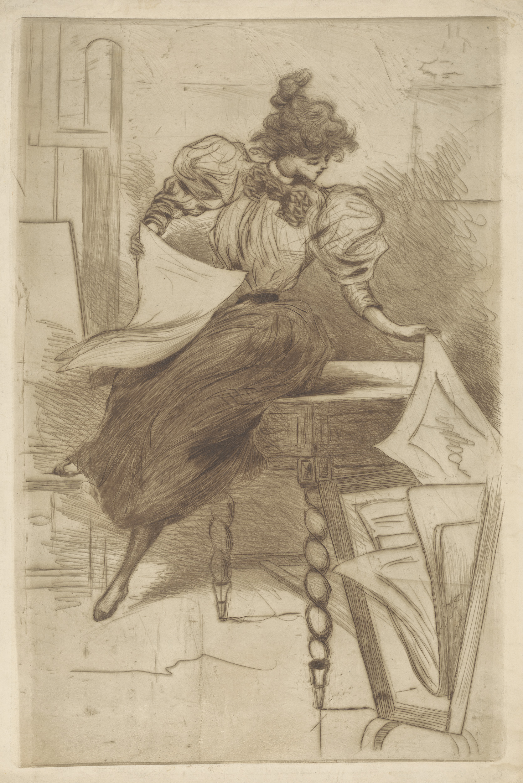 Zittende prentverzamelaar omgeven door portolio's, n...