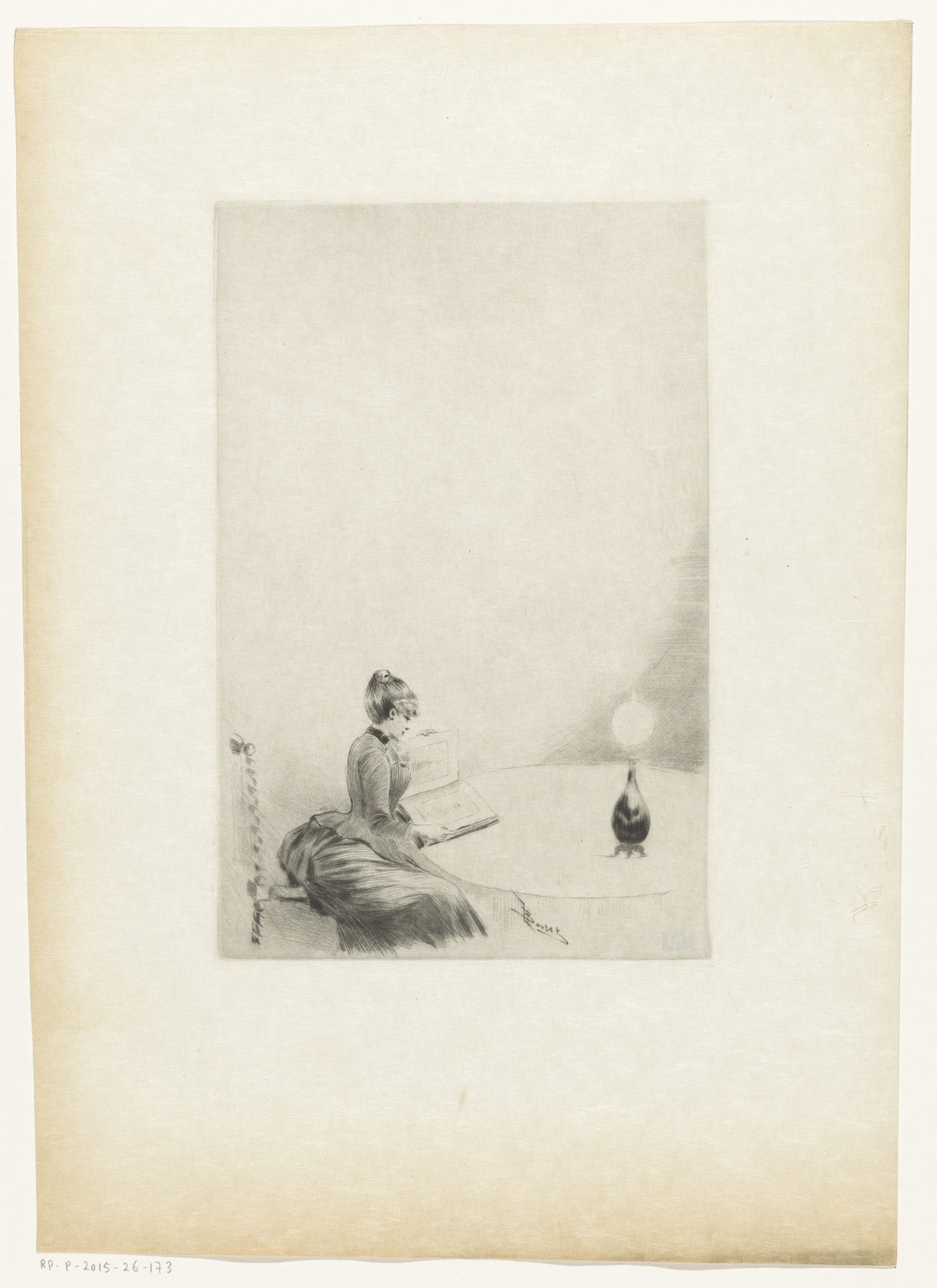Zittende vrouw met een album aan tafel