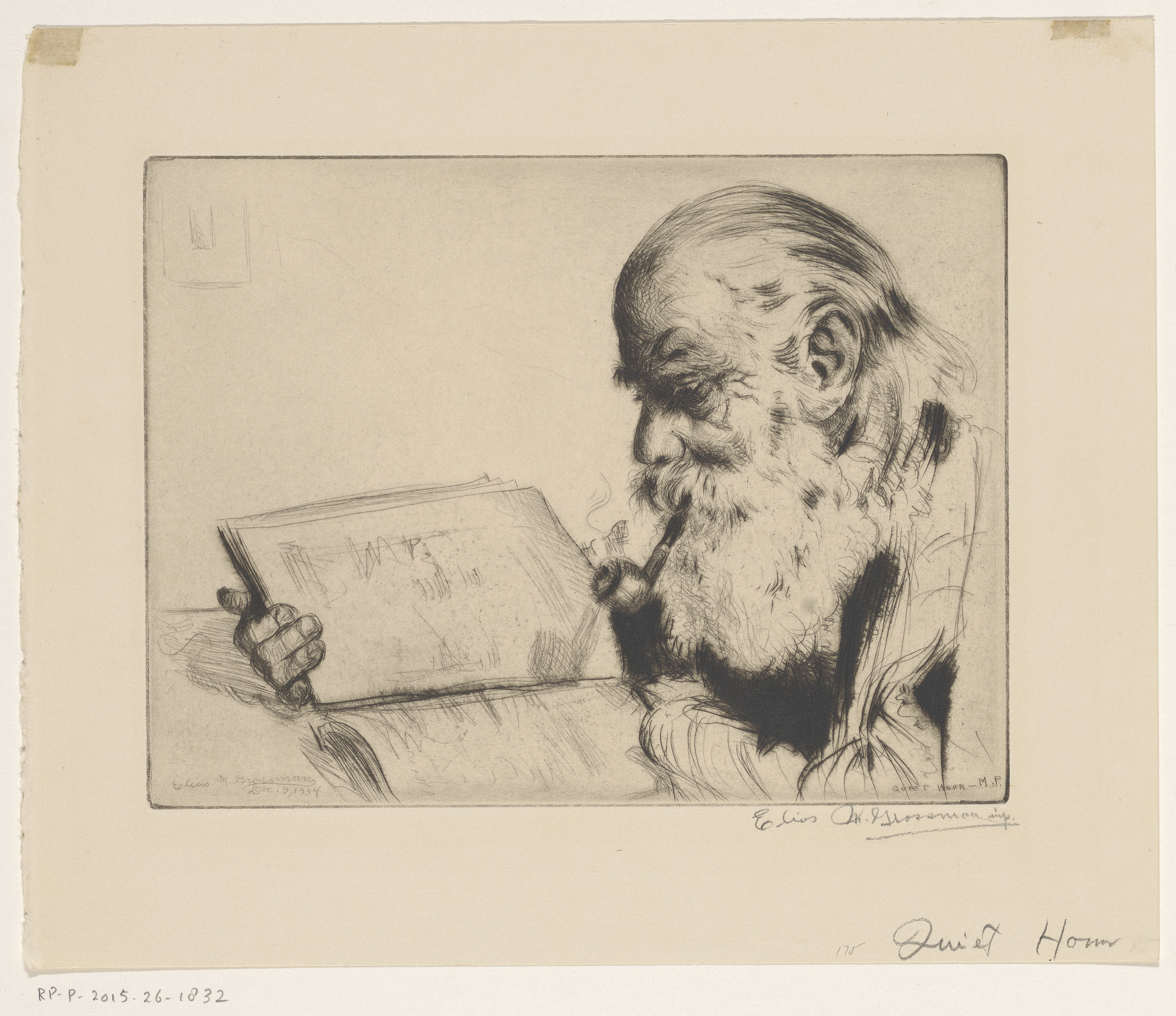 Oude man met een pijp, lezend in een boek