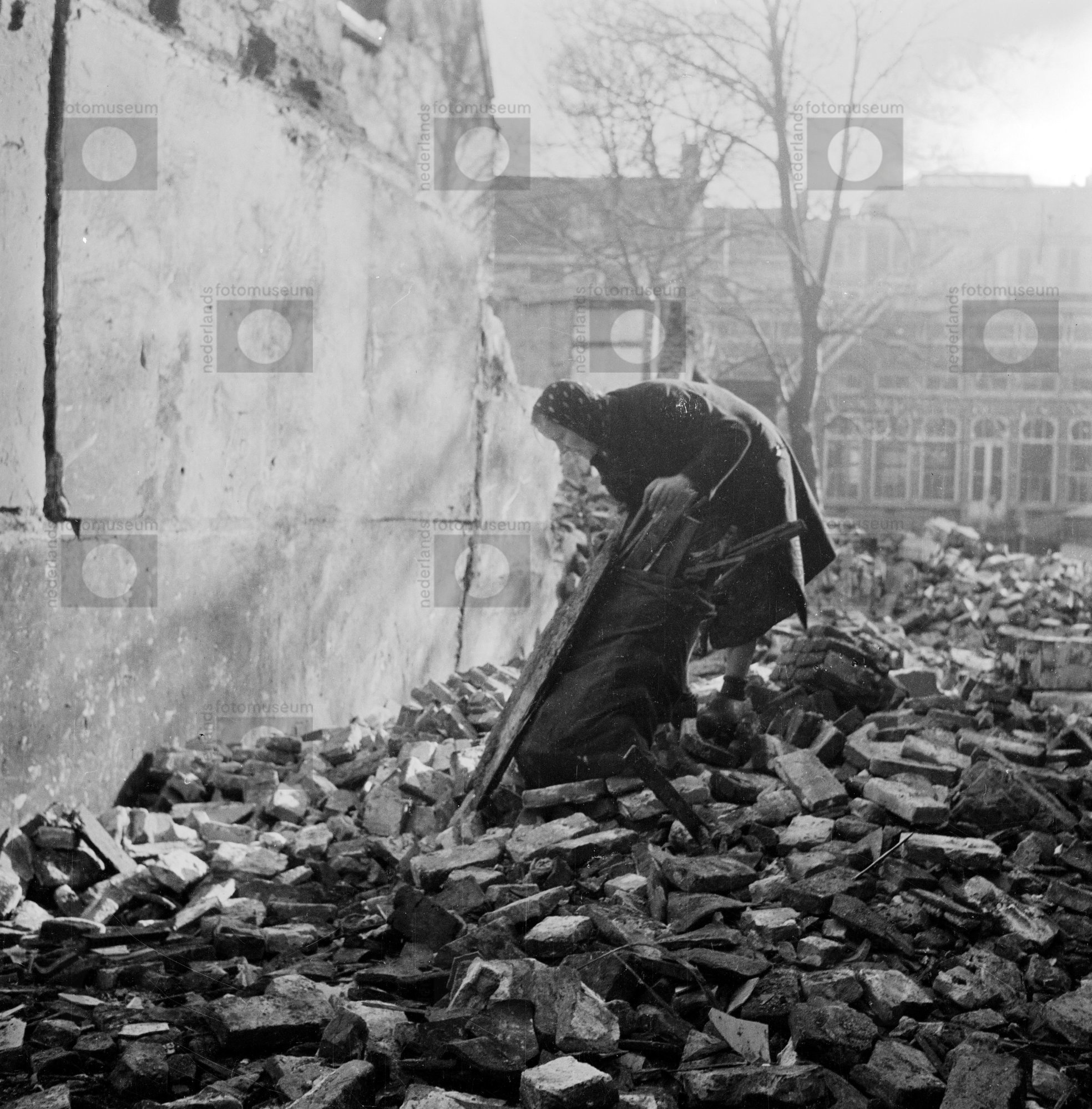 Een vrouw verzamelt brandhout uit een gesloopt stads...