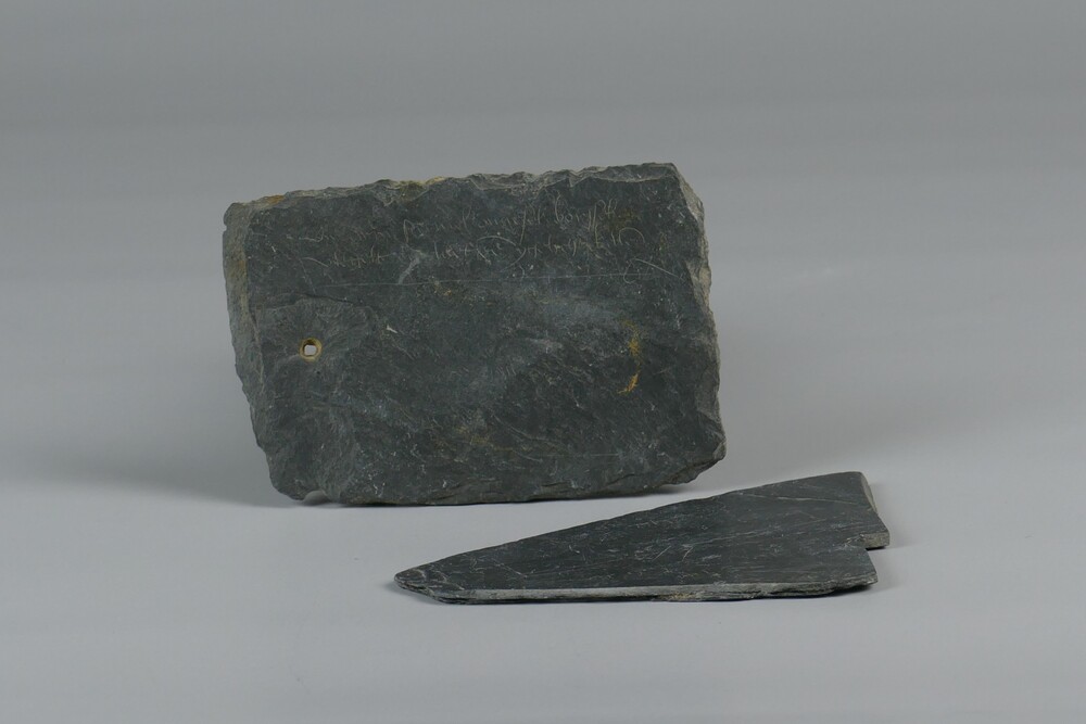 Leisteen met gegraveerde tekst en tekening van twee ...