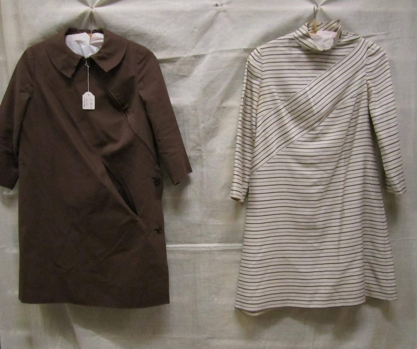 Ensemble bestaande uit jurk van bruin/wit gestreepte...