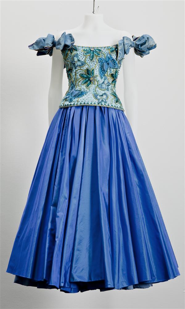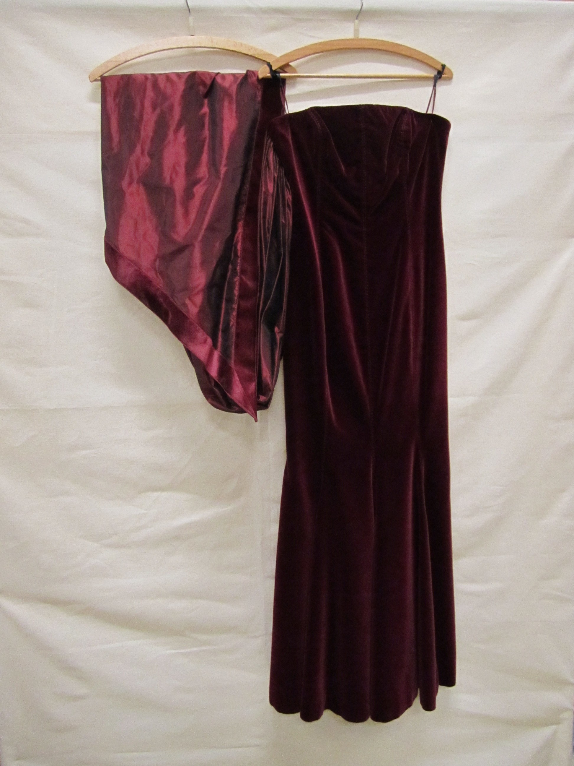 Avondjurk van donkerrood zijde fluweel, strapless, p...