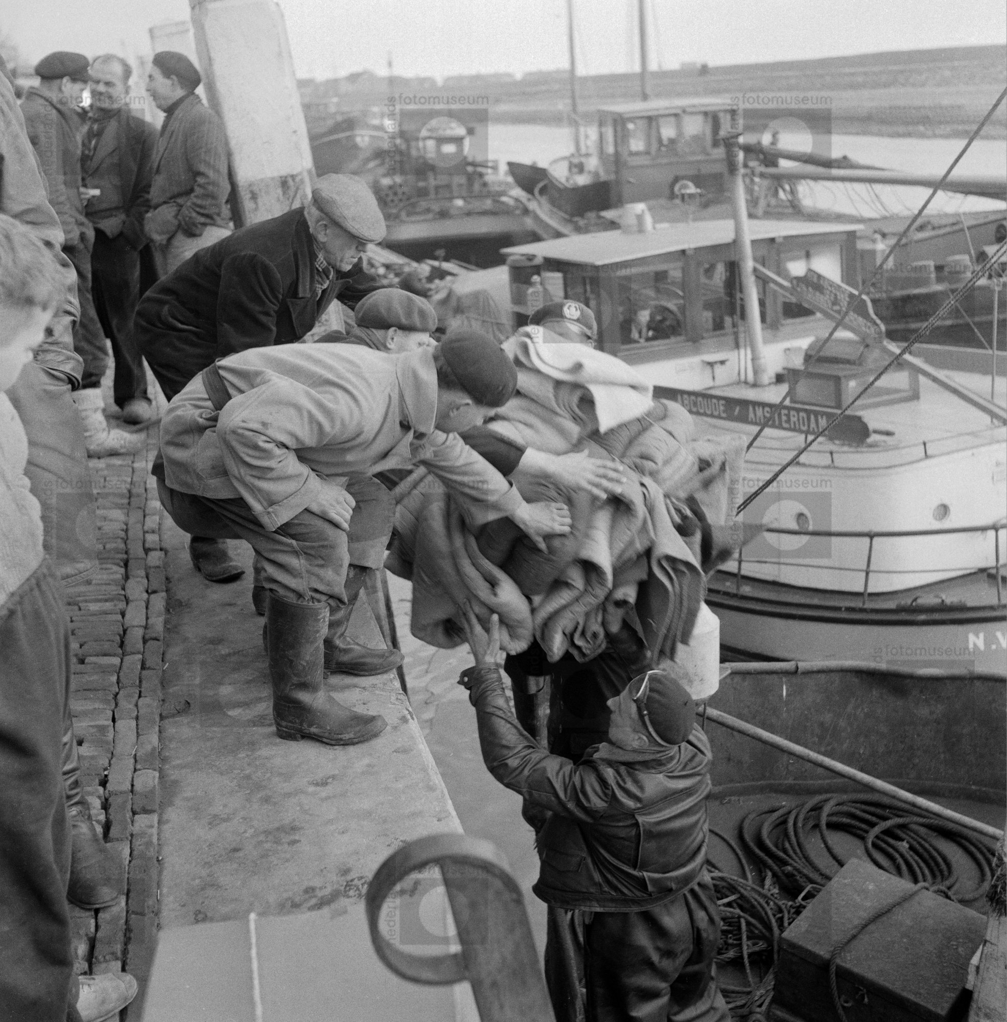Hulpverleners takelen stapel dekens op schip, Waters...
