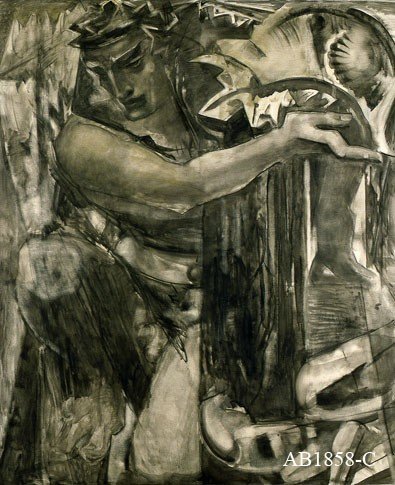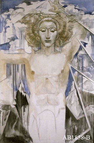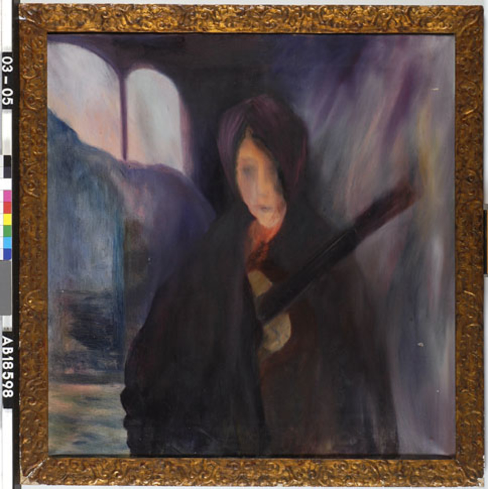 Figuur in cape met muziekinstr.?(levensfakkel?)