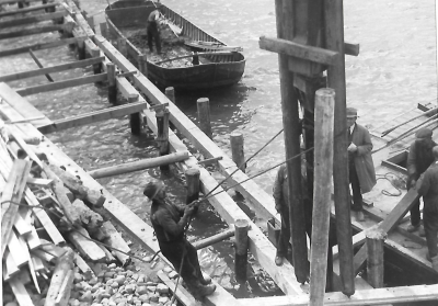 Arbeiders bezig met het verzwaren van een zinkstuk d...