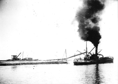 Stoomschip bezig met het opspuiten van zand op een d...