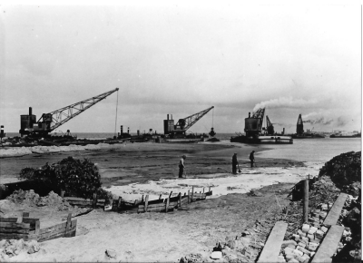 Opspuiten van zand, mogelijk voor de bouw van de dij...