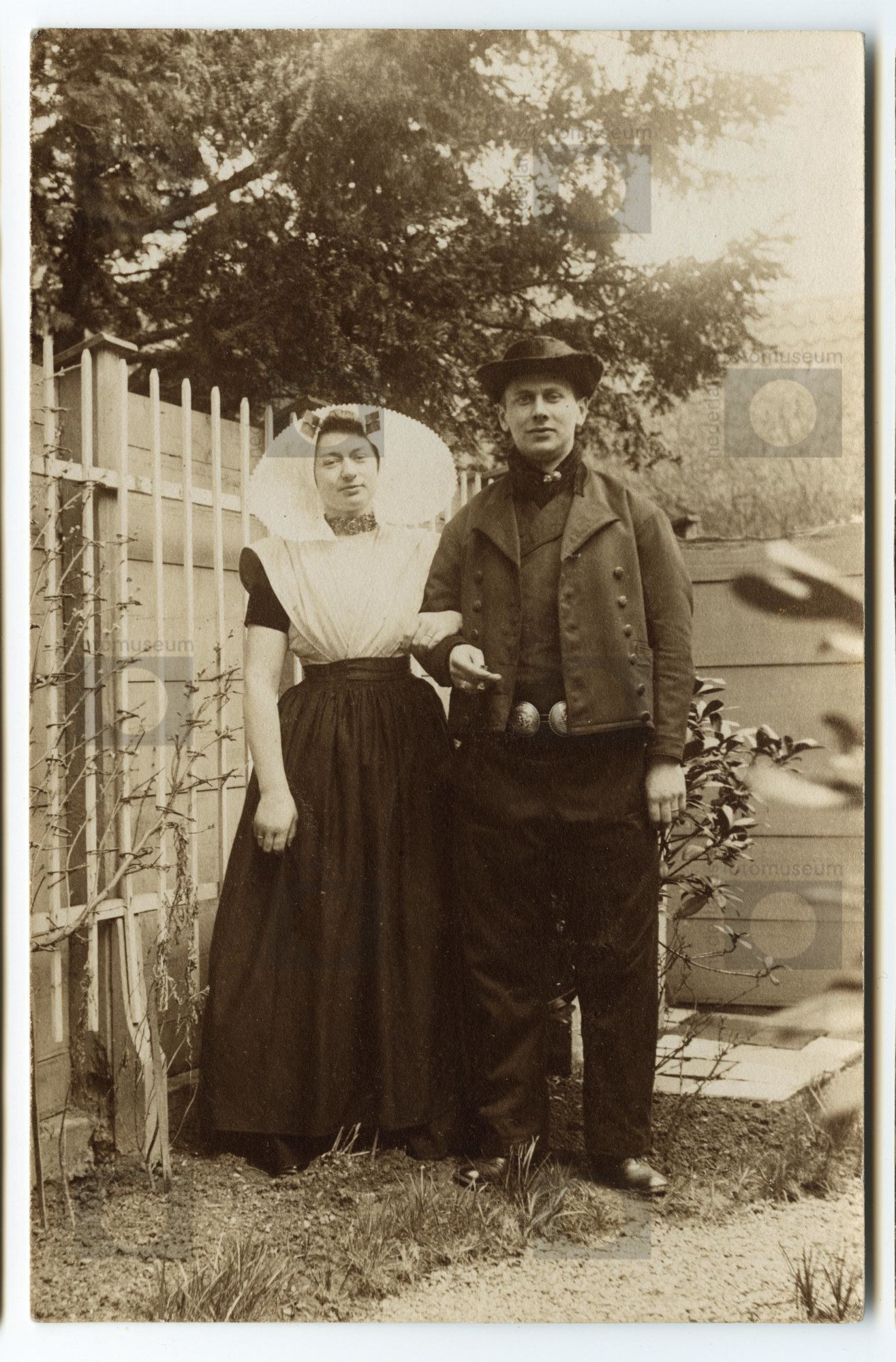 Ansichtkaart, dubbelportret van vrouw en man in Zuid...