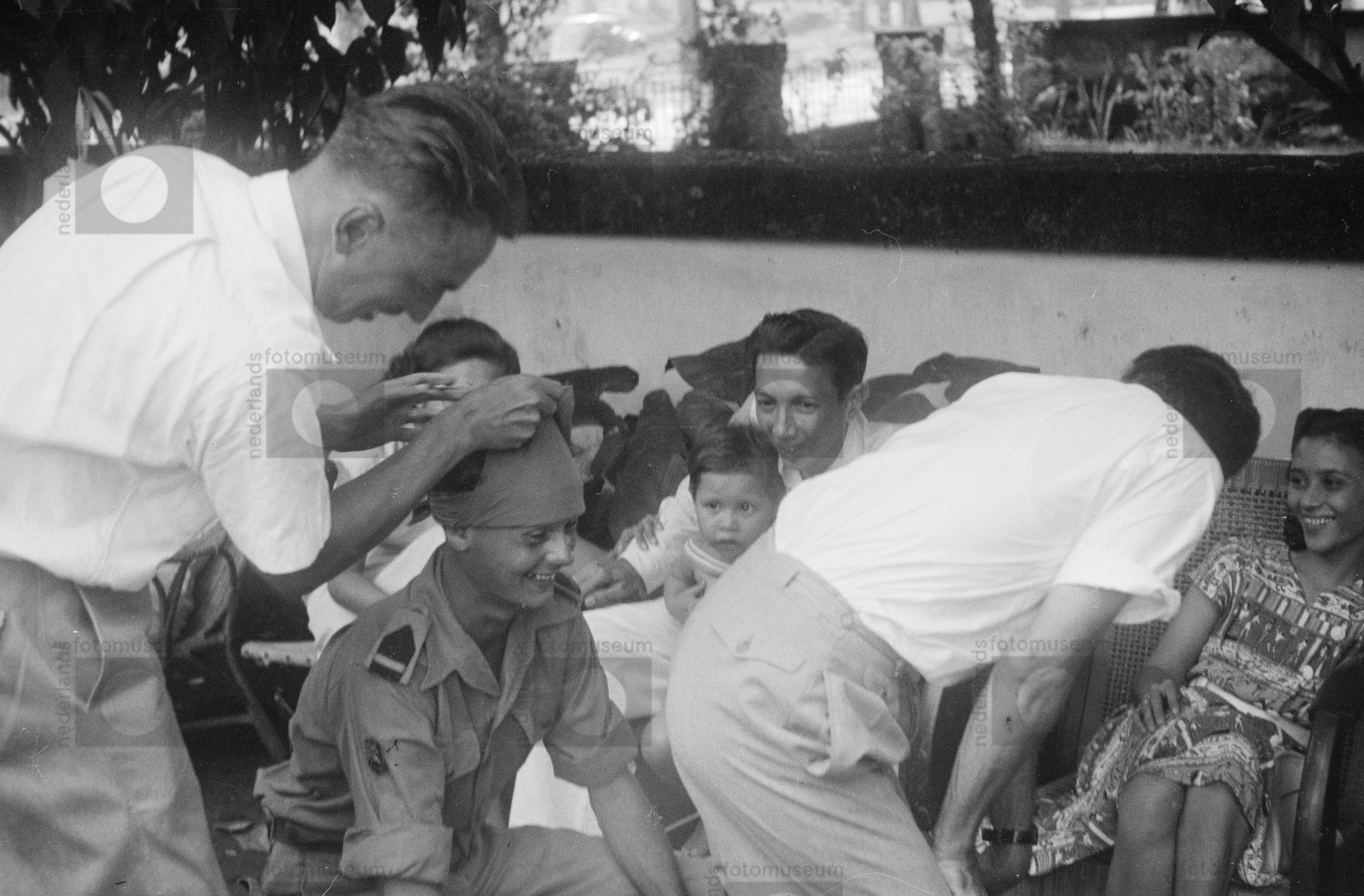 Feestje in de tuin van burger Ed Nuse aan de Reinier...