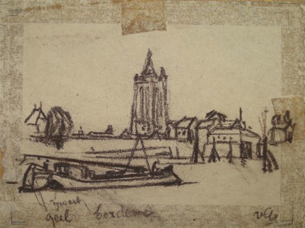 schets in bruin krijt,schip met dorp, periode 1940-1...