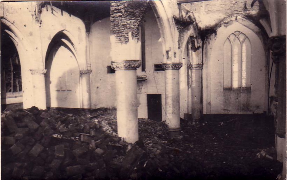 Interieur van verwoeste Ned herv kerk te Kerkdriel.