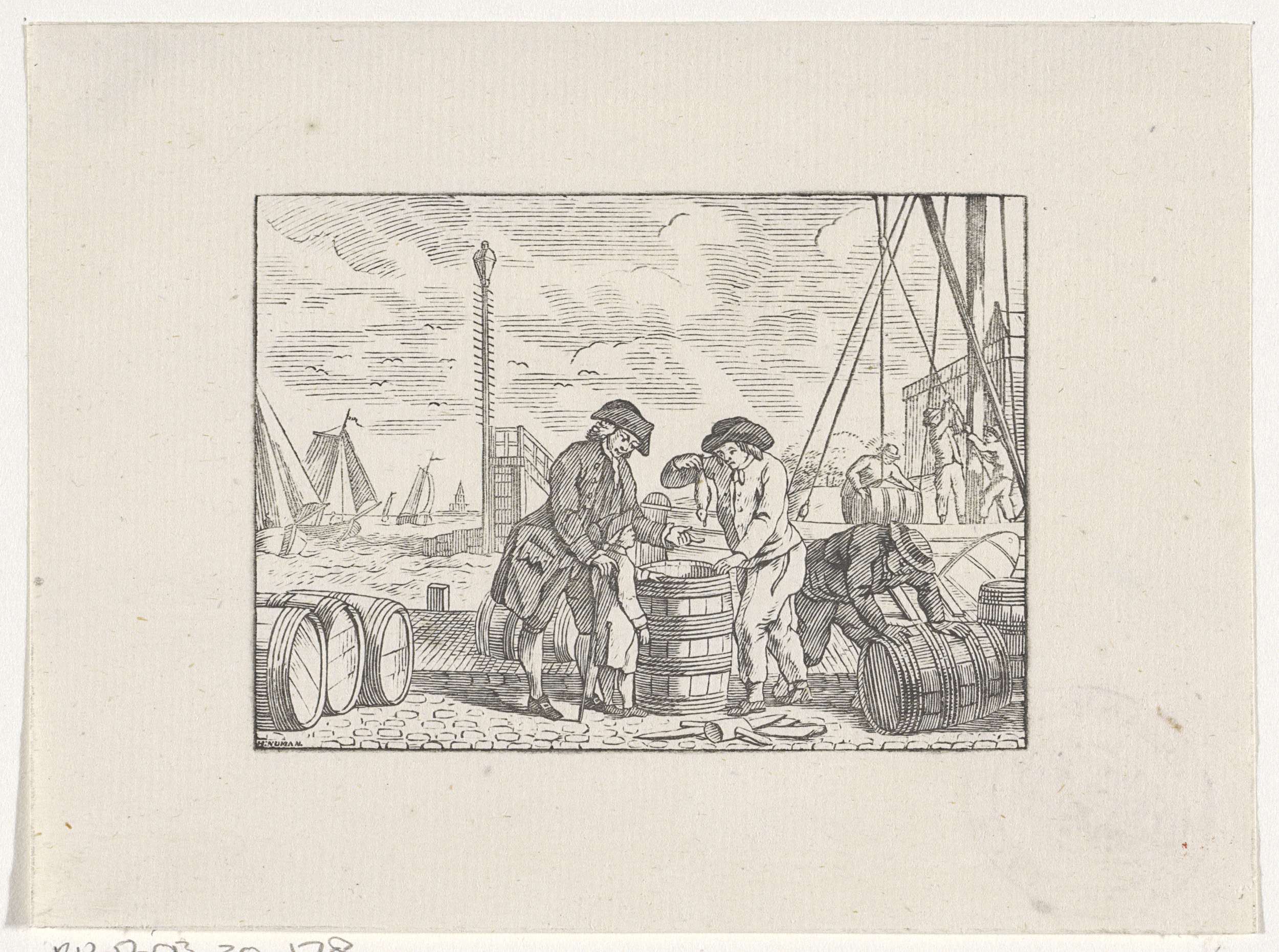 Mannen op een kade met tonnen vis aan het werk