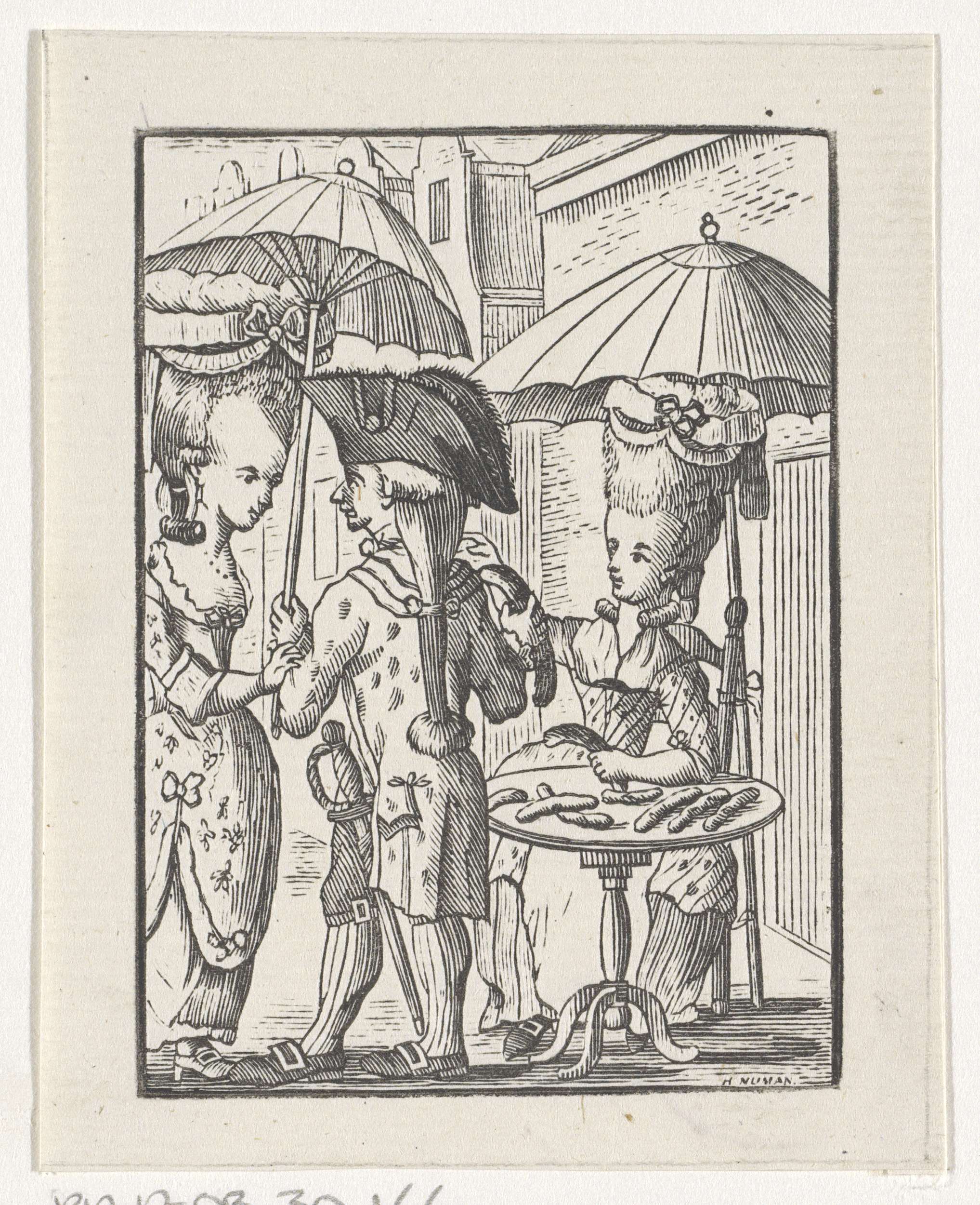 Straatverkoopster van worsten met twee klanten