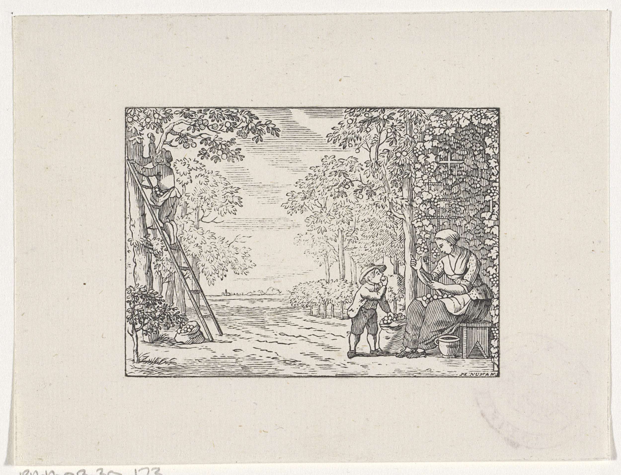Vrouw in een boomgaard wil voor een jongen zijn appe...