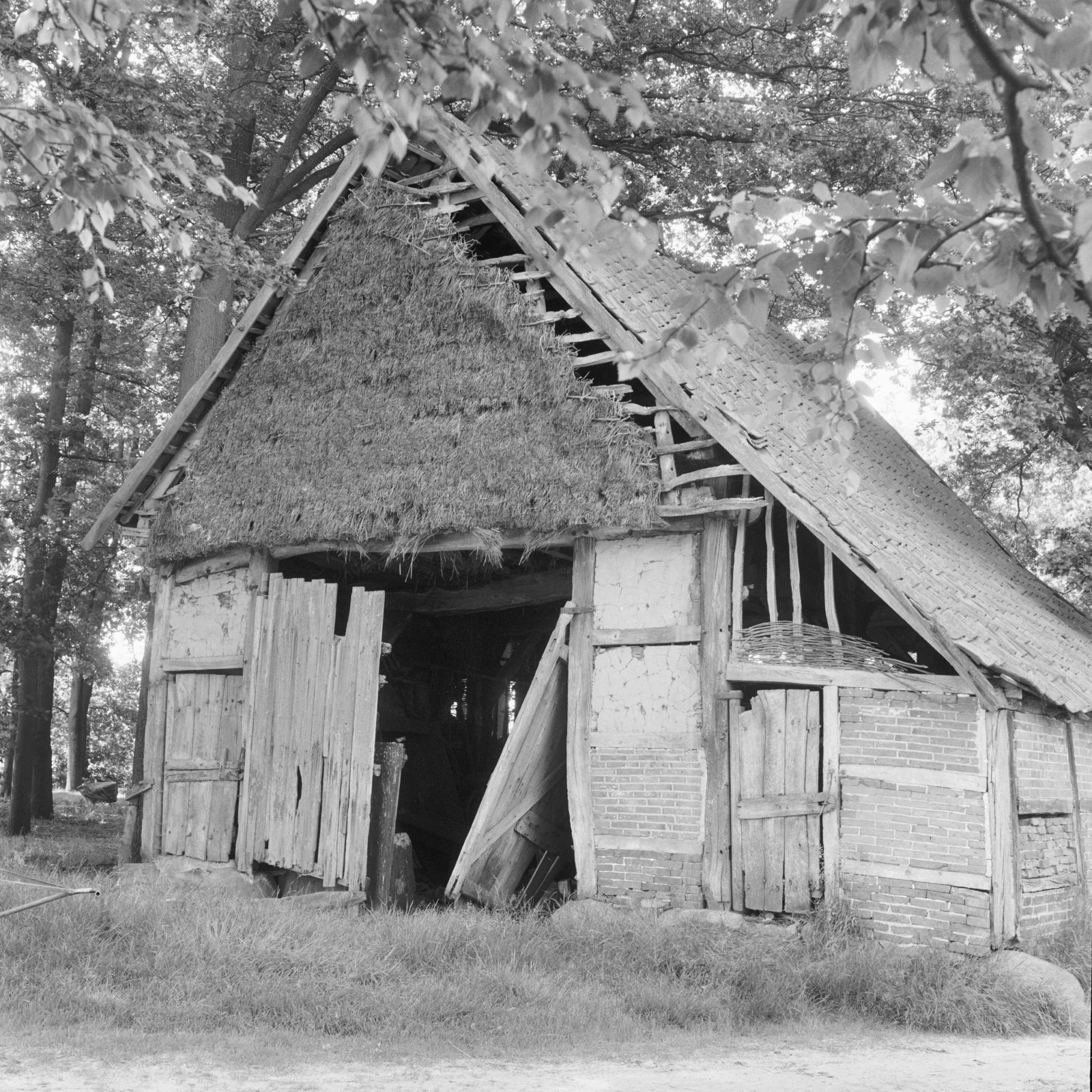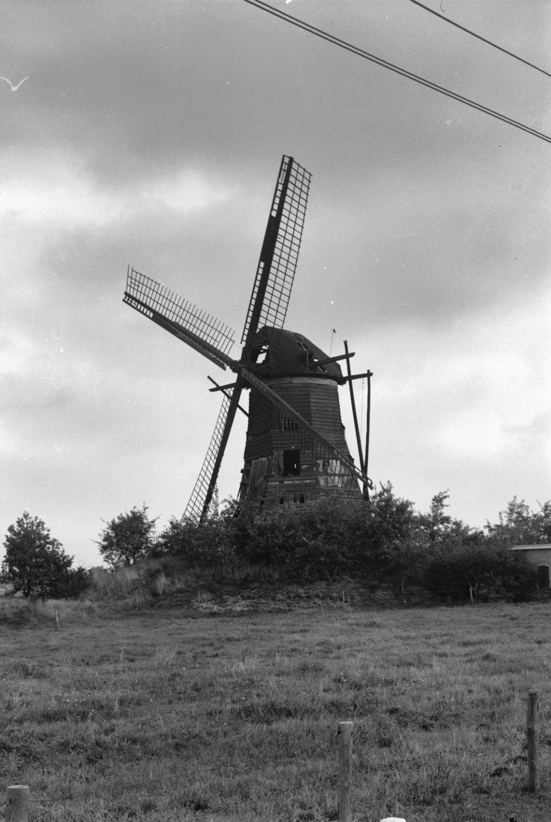Achtkante beltmolen in vervallen staat van opzij gef...