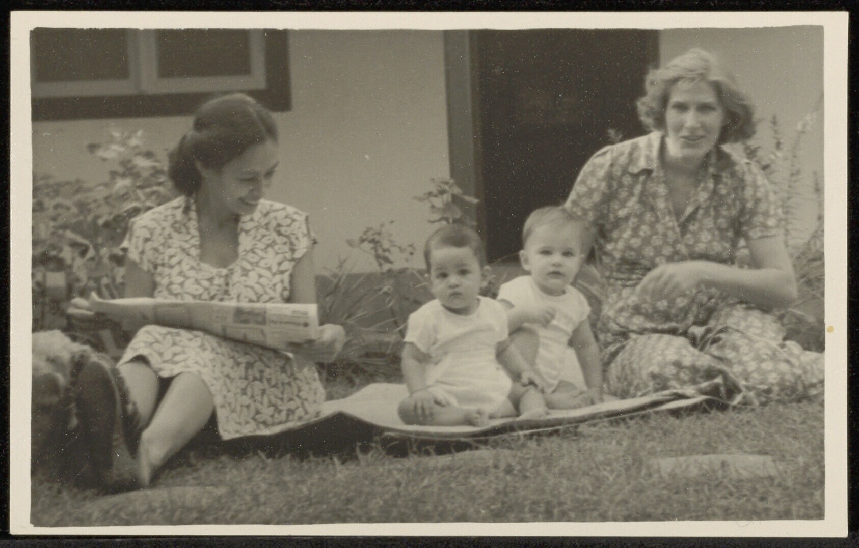 Portret van vrouw en kinderen in de tuin