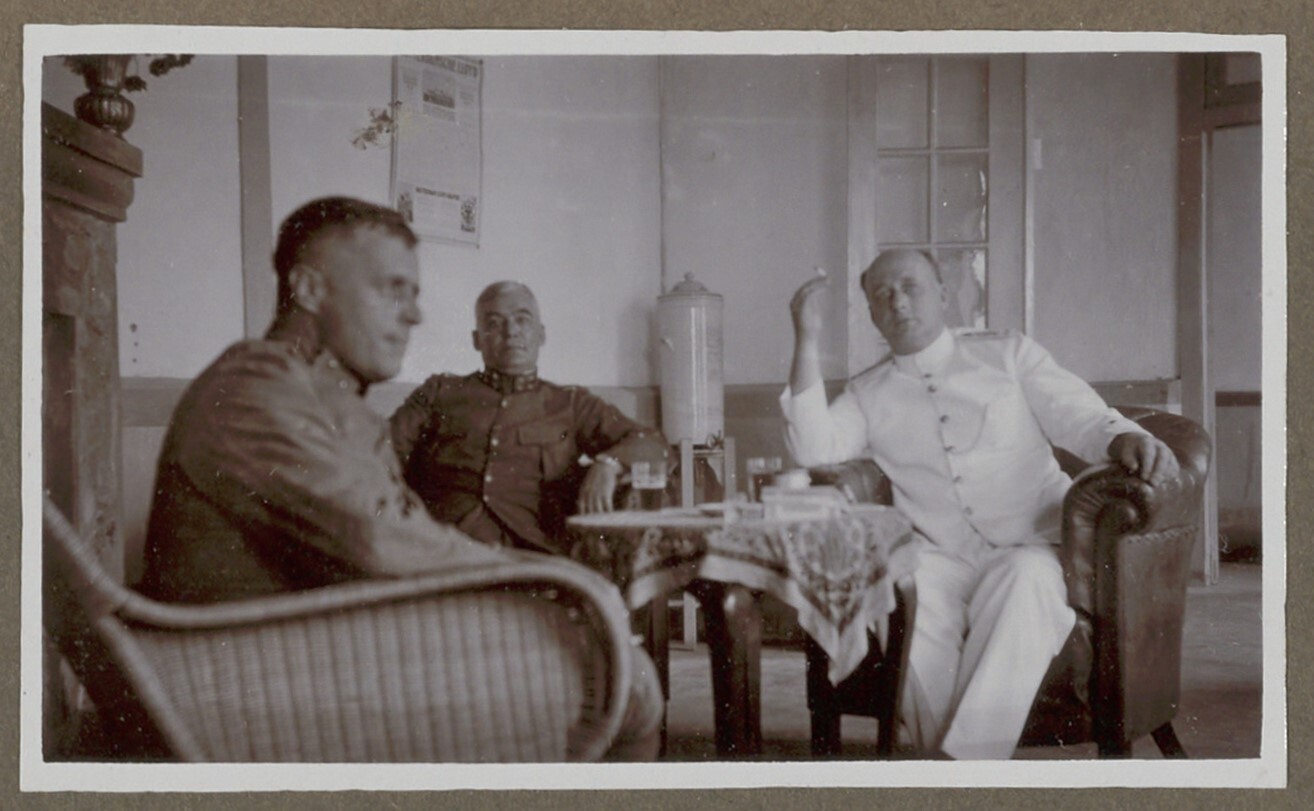 Drie legerofficieren aan tafel