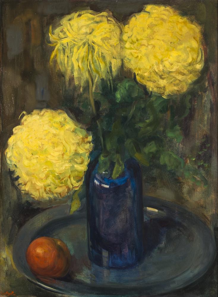 Stilleven met gele bolchrysanten in blauwe fles