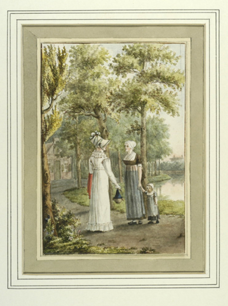 Een dame en een vrouw met kind op een bospad. 1e kwa...