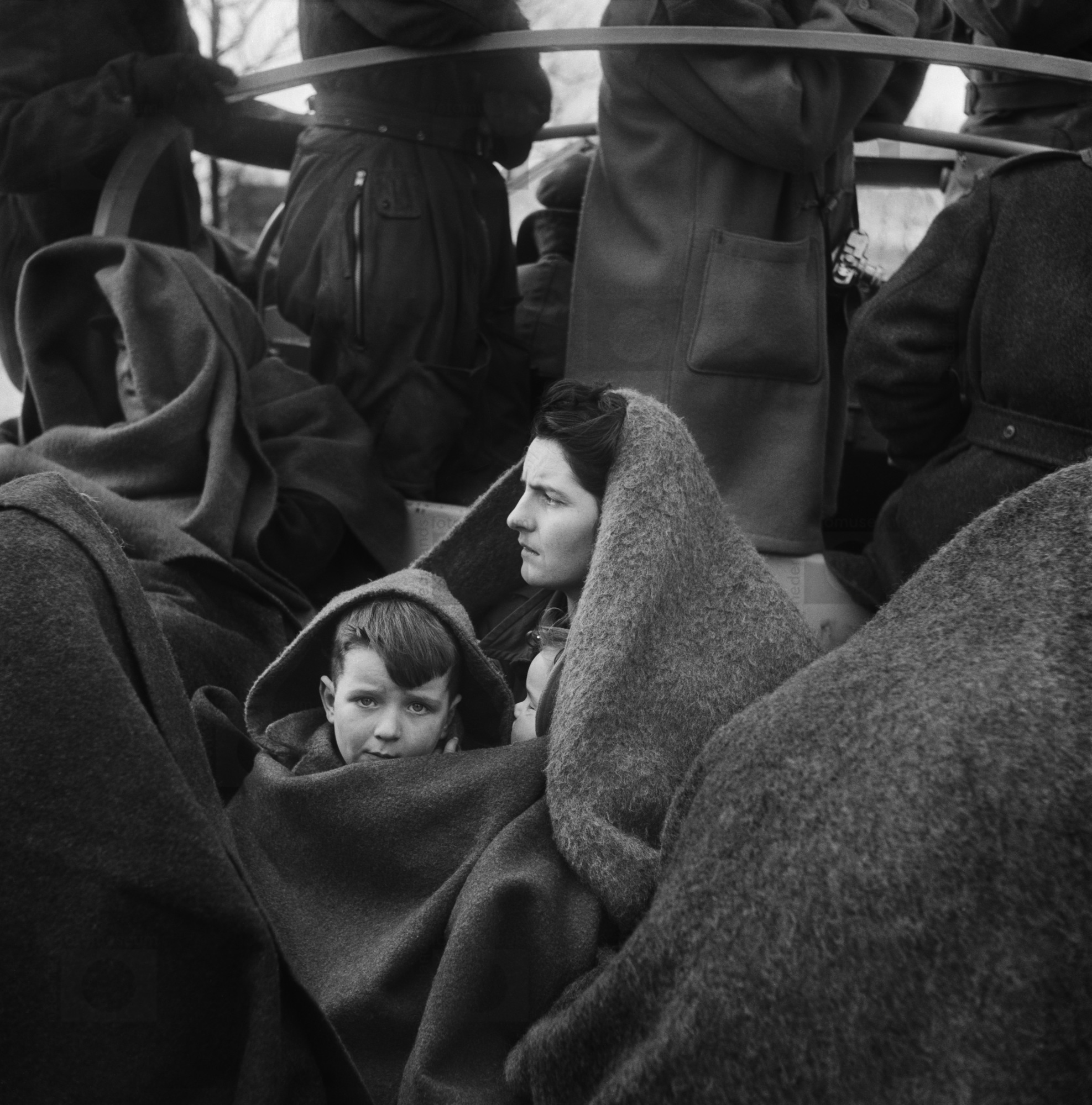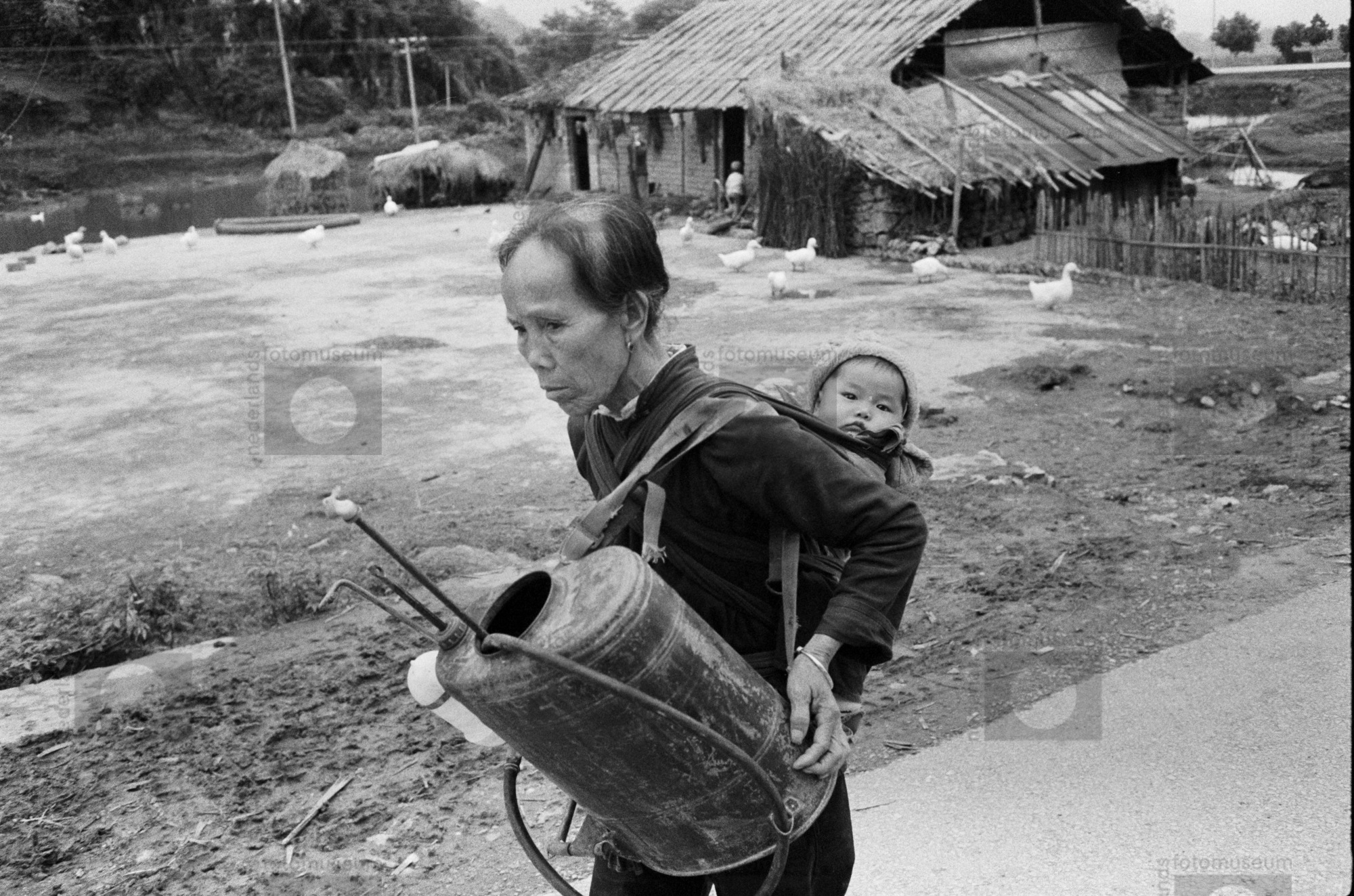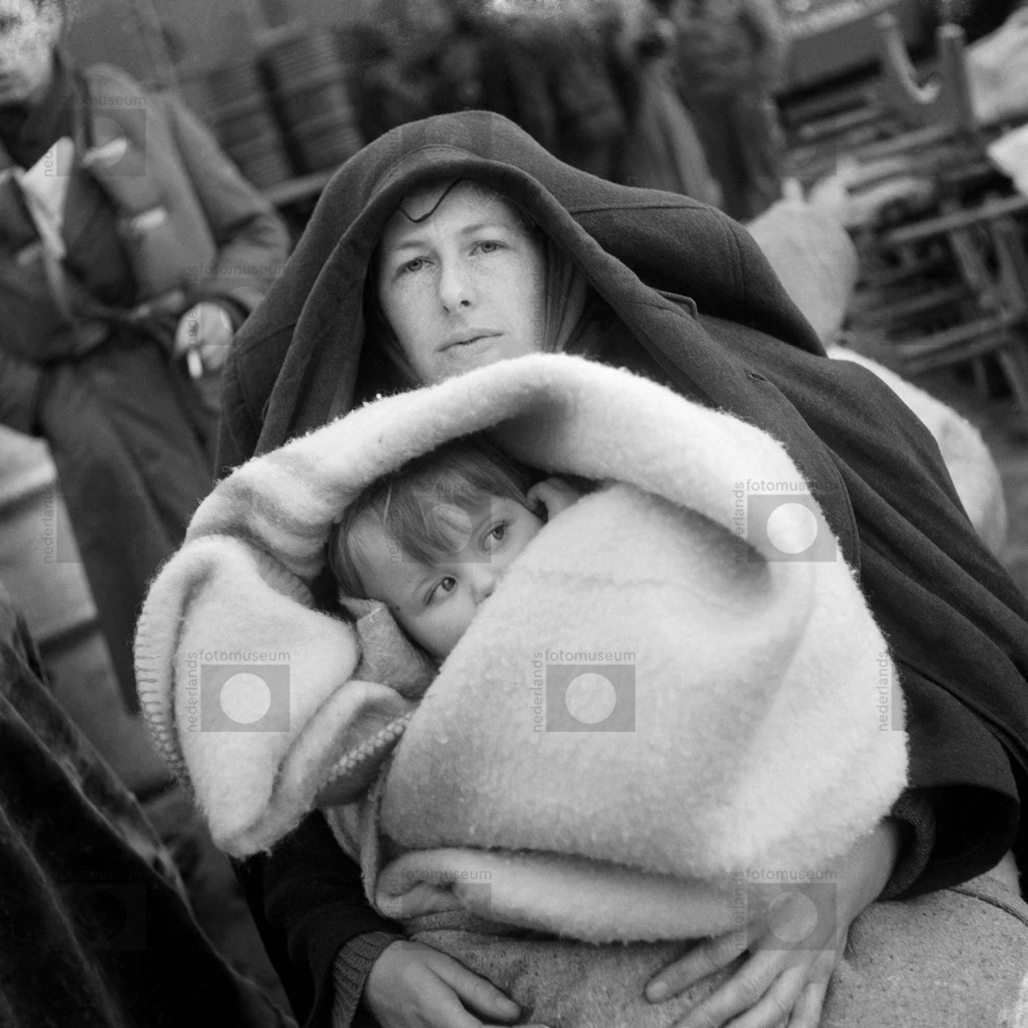 Vrouw, met kind in deken gewikkeld, verlaat per boot...