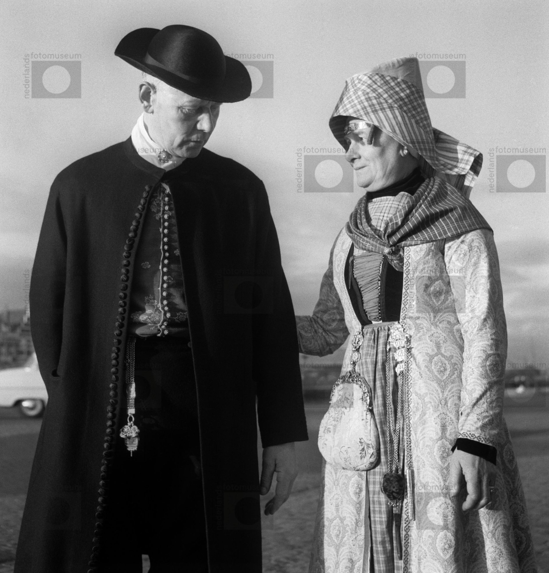 Man en vrouw in traditionele klederdracht, Hindeloop...