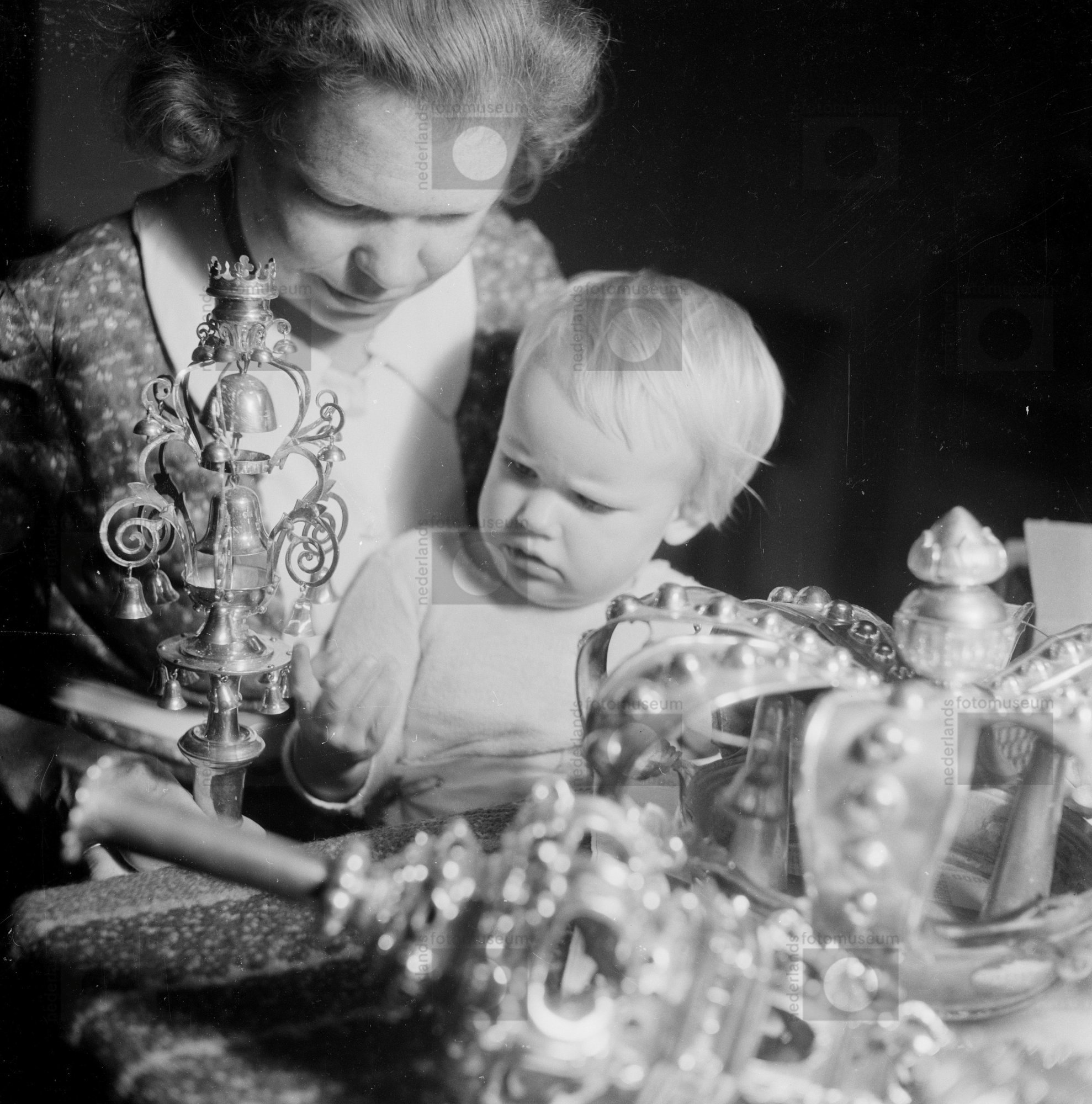 Vrouw en kind bekijken de inhoud van een kist met aa...
