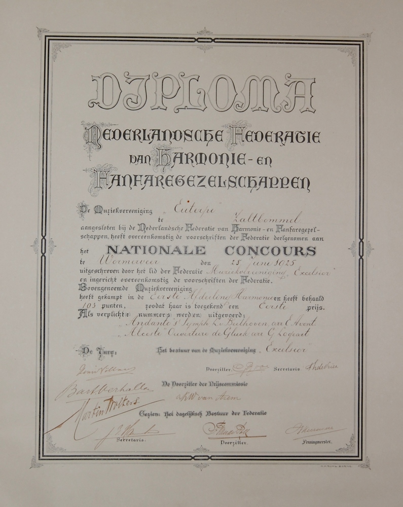 Diploma, behaald door Euterpe te Zaltbommel, 1e prij...