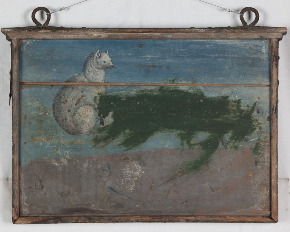 uithangbord van hout met hert en teksten en aan beid...