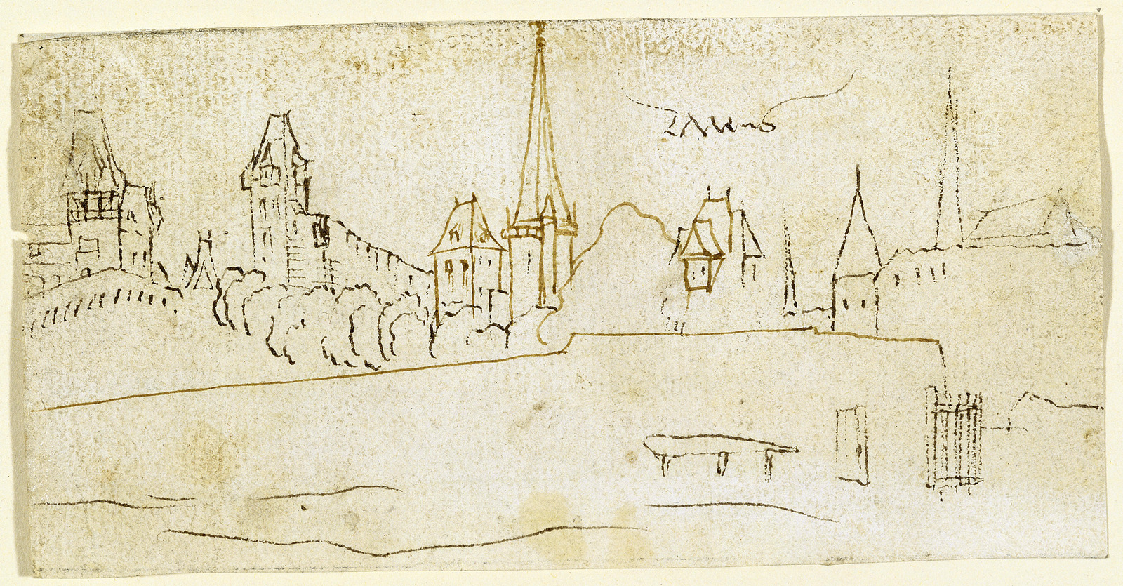 Stadsgezicht (recto); schetsen van vier vrouwen hoof...