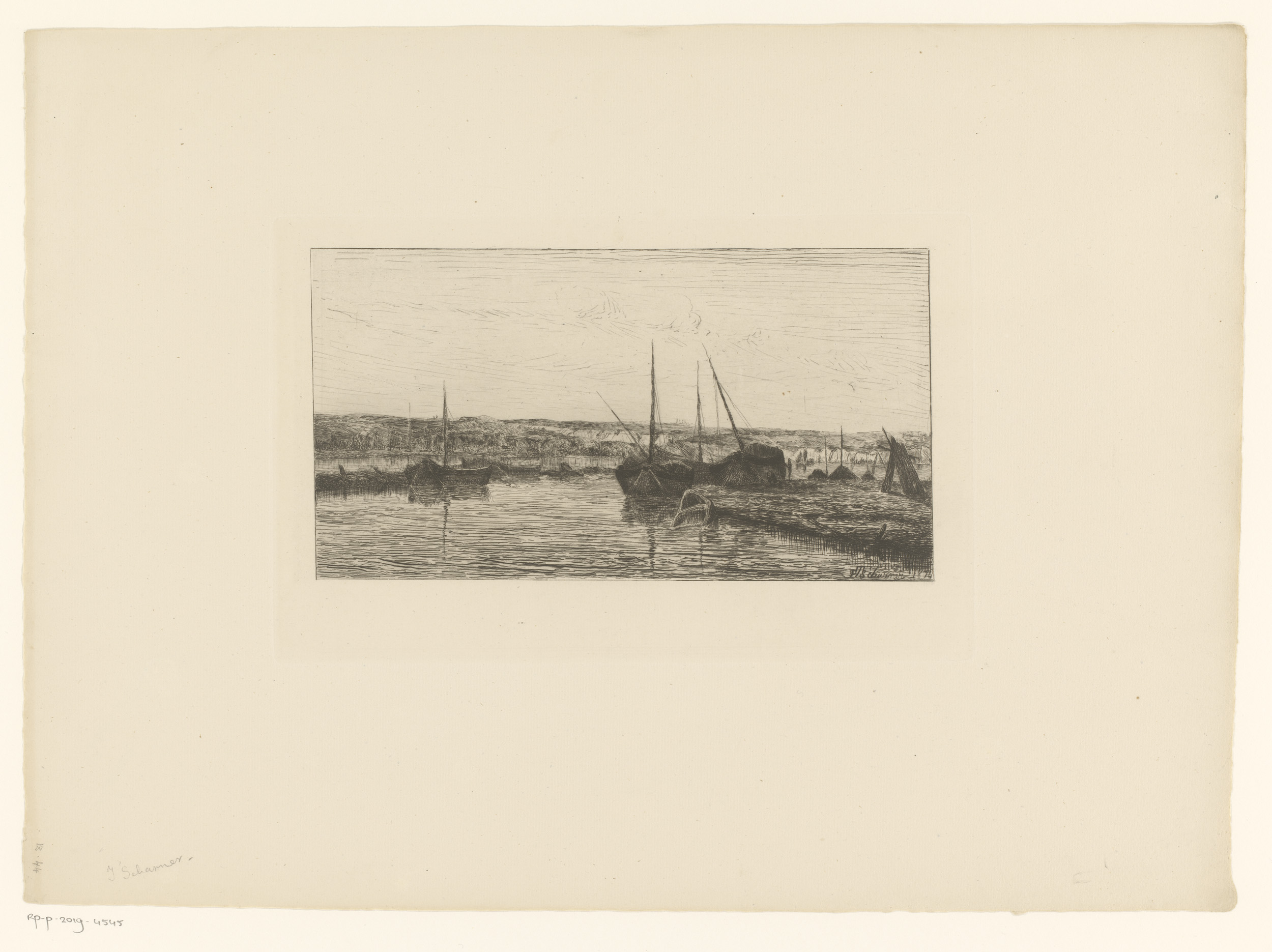 Rivierlandschap met aangemeerde zeilboten