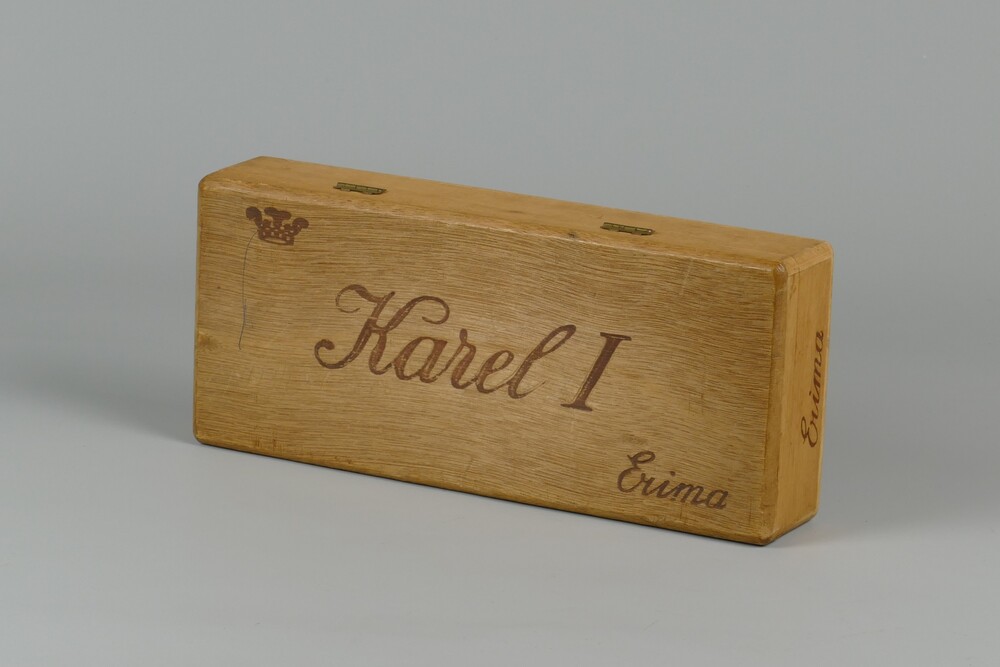 Sigarenkist van hout met bruine opdruk Karel I Erima.