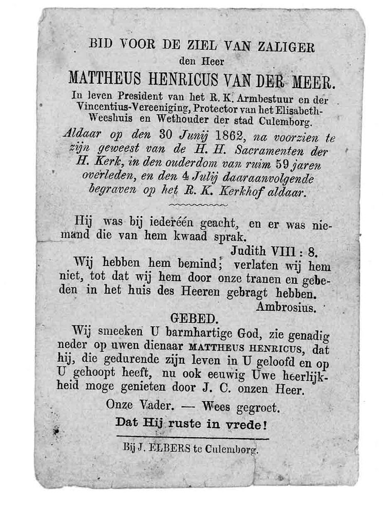 bidprent voor Mattheus Henricus van der Meer. Gebore...