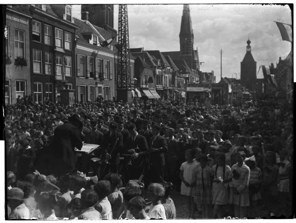 Foto, voorstellende de Markt met muziekkorps en mens...