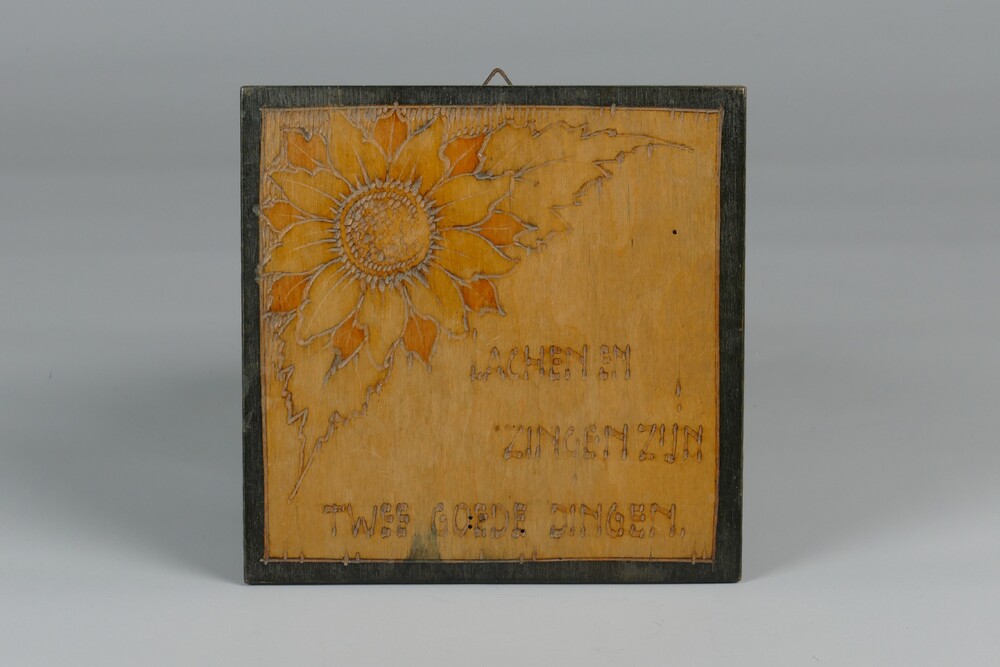 Wandversiering van triplex met bloemmotief en spreuk...