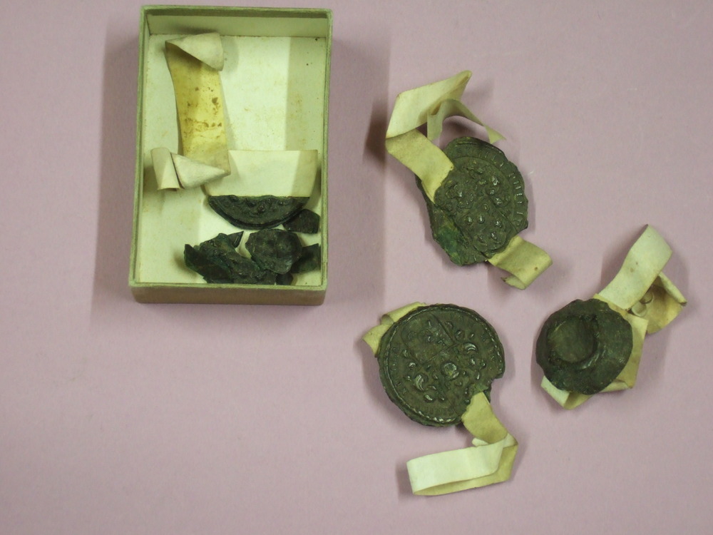 Zegels van bruine lak met lint in kartonnen doosje.