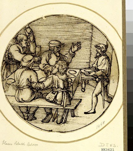 Vier mannen aan een tafel, een vijfde die een bord b...