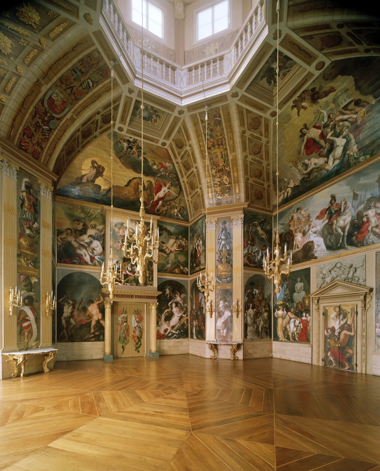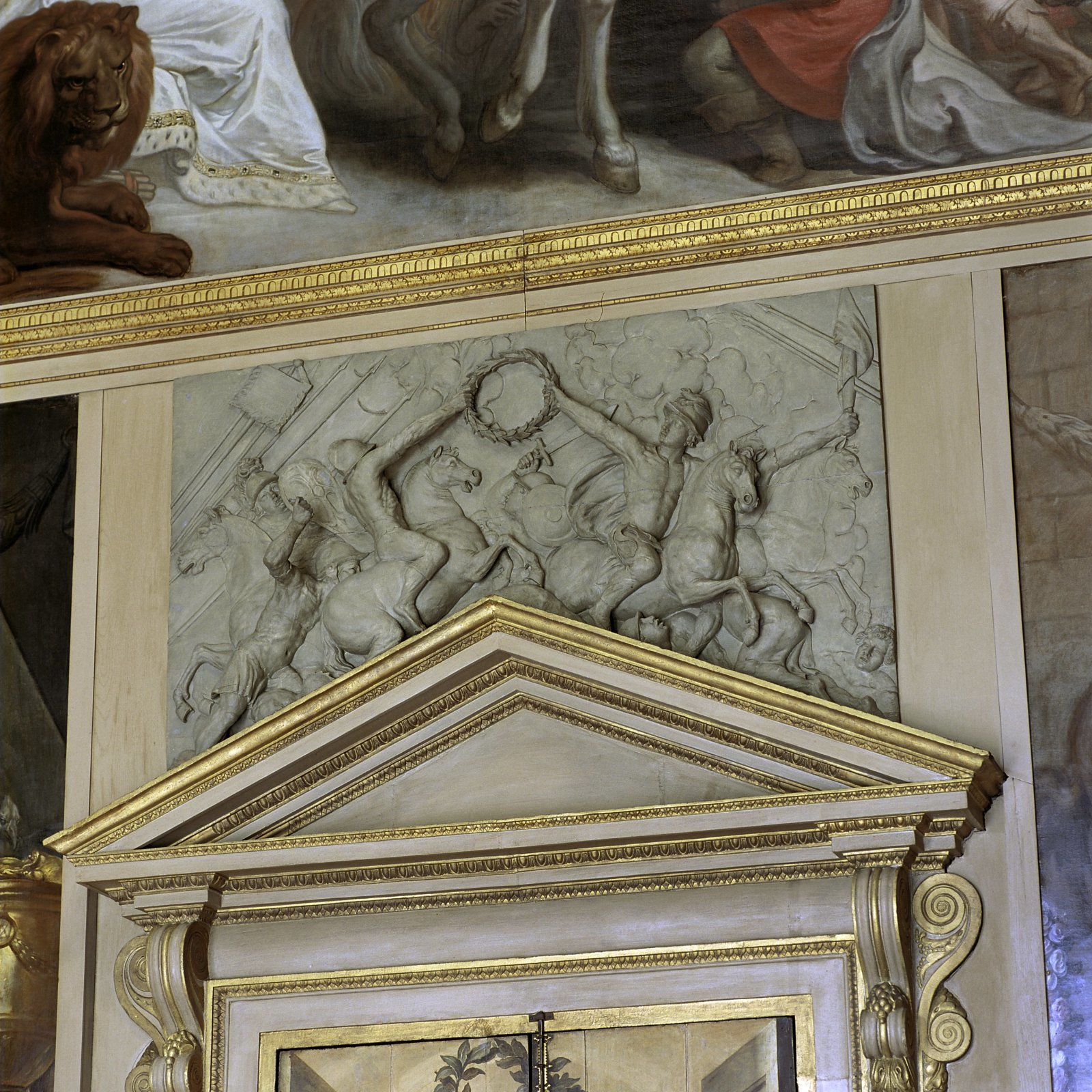 Oranjezaal na de restauratie: snijwerk boven hoofdin...