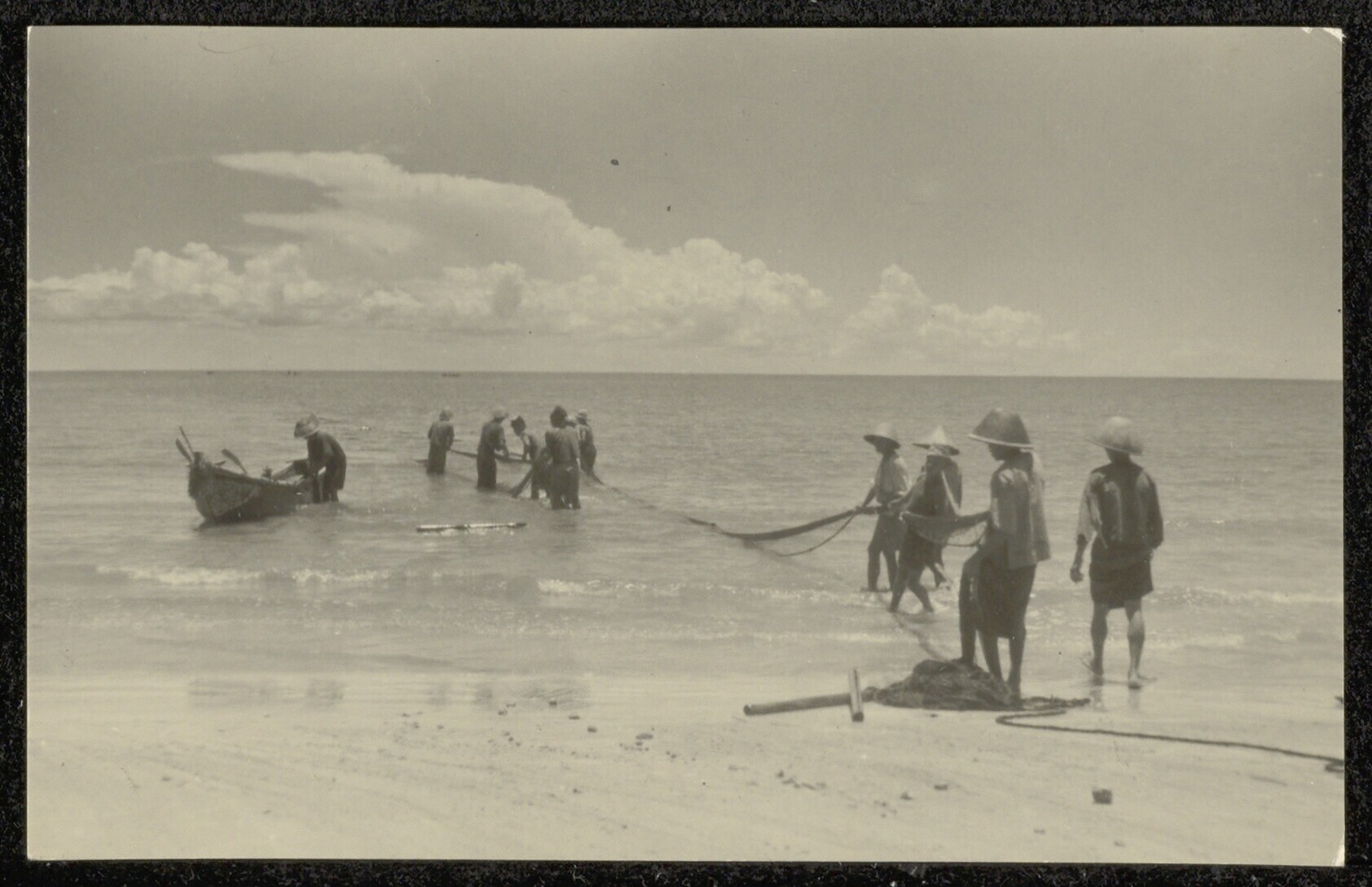 Vissers met netten in de branding bij Tjisolok, Wijn...