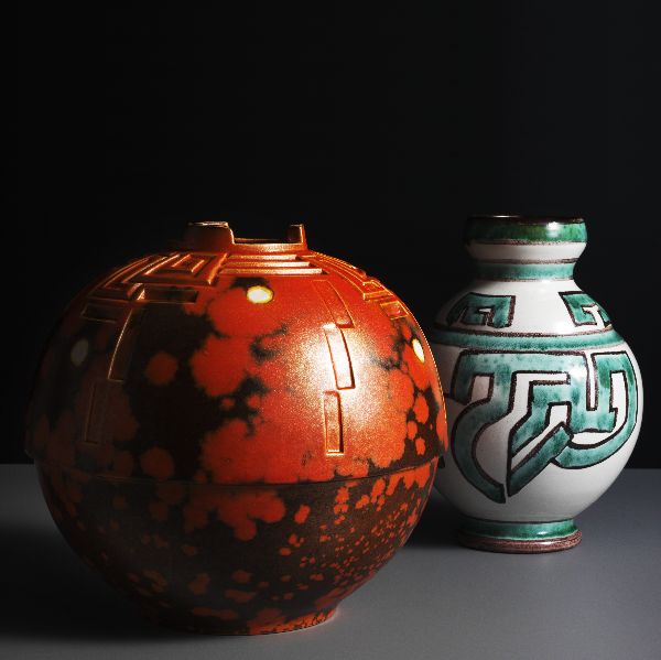 Twee bolvazen, de linker met decor Pudora