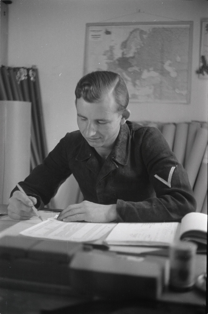 Een Luftwaffe Obergefreiter zit aan een tekentafel.