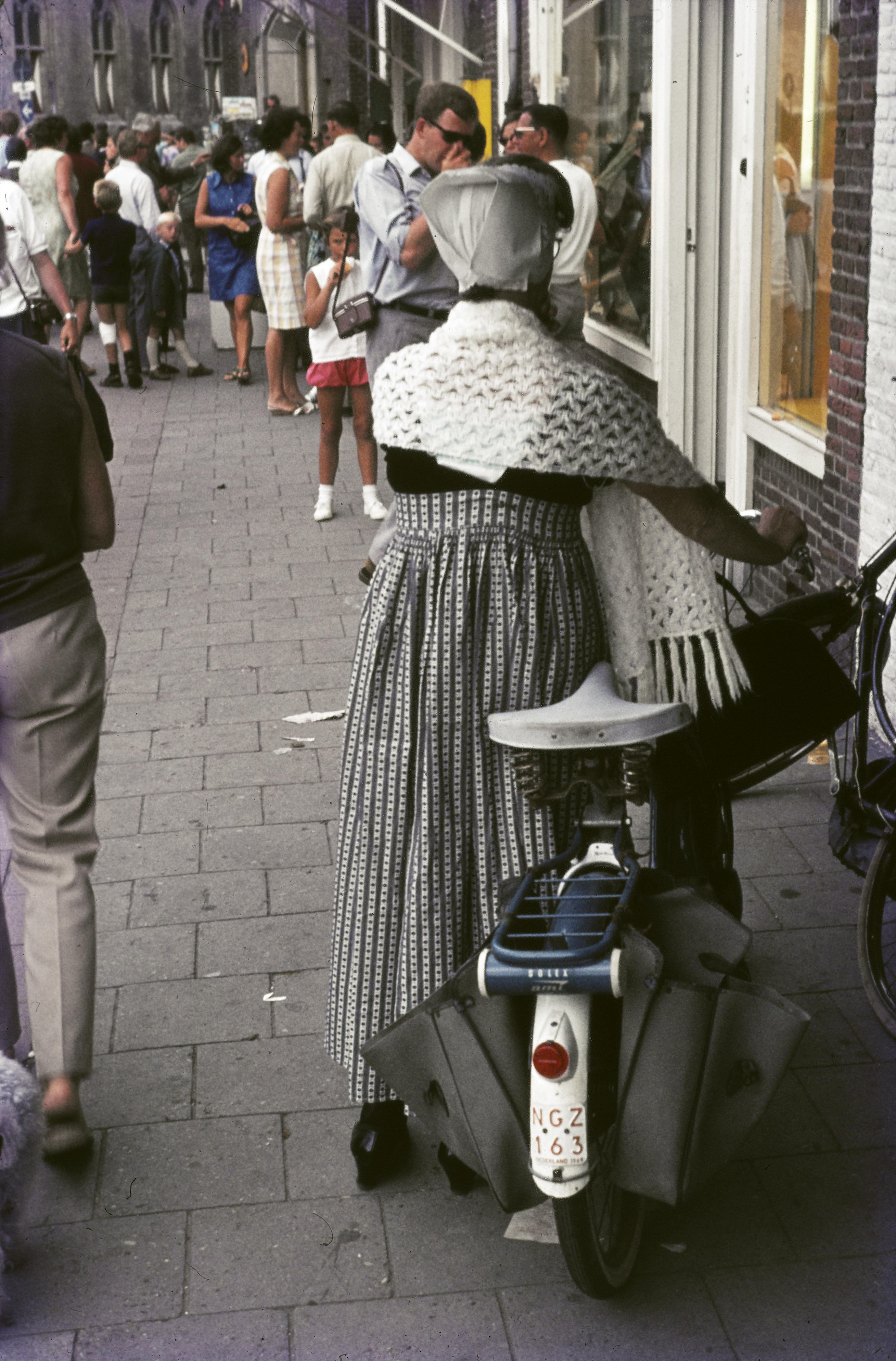 Vrouw in Walcherse streekdracht met brommer, 1969 (d...