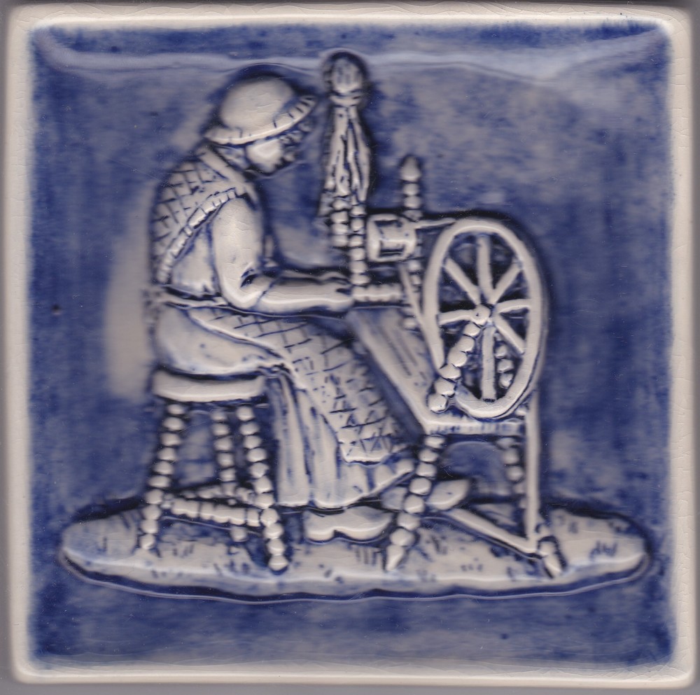 Tegel in reliëf, met voorstelling: spinster, vervaar...