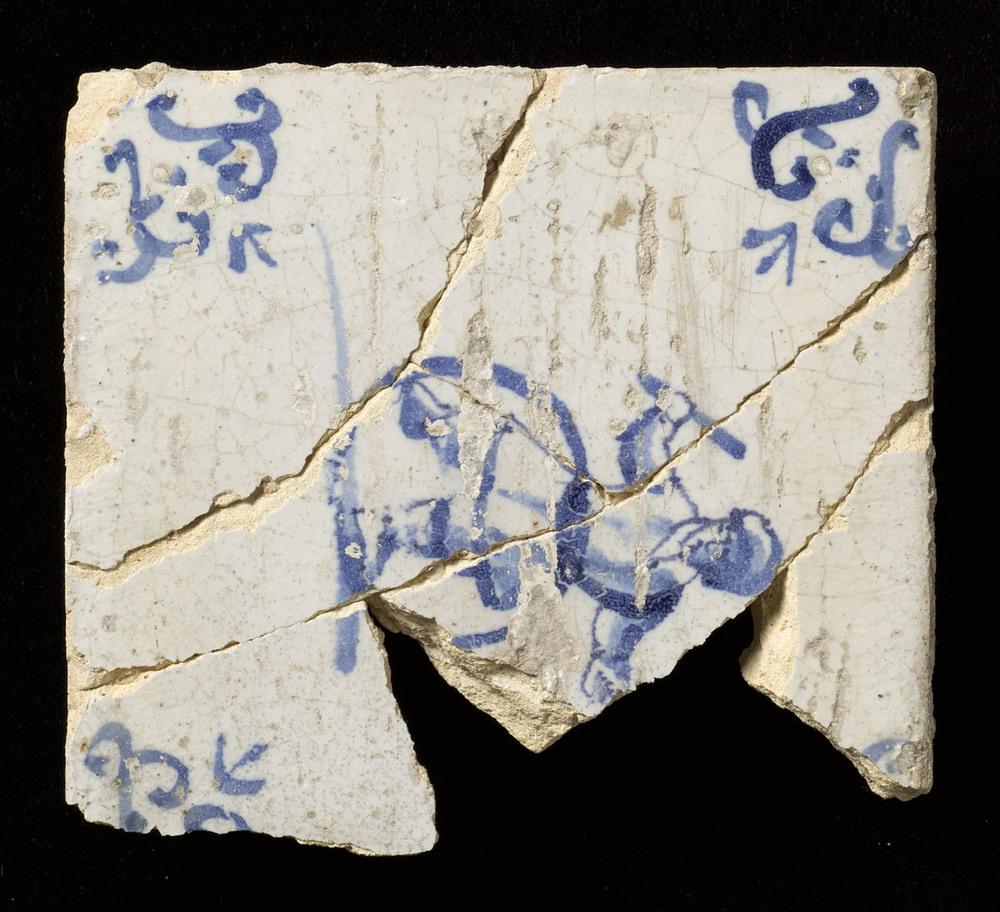 Tegel van keramiek met tinglazuur, voorstellende: De...