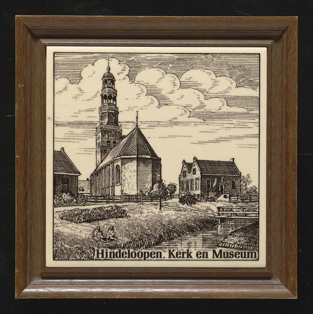 Tegel met transferdecor en titel 'Hindeloopen. Kerk ...